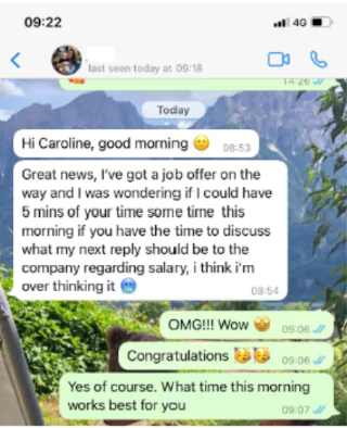 I like that I was given a clear indication of what I signed up for and both Caroline and Eunice were very supportive throughout the journey. They helped me by  being supportive, encouraging and honest. Caroline had a clear strategy and I liked how it was all hands on deck from day one. I got an offer in six weeks!