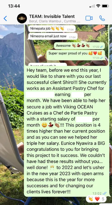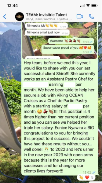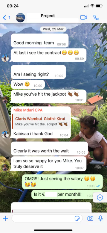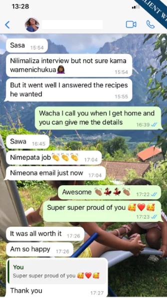 For someone who needs to know what is happening, I was glad to be able to keep tabs of the work that was being done. I also appreciated the follow-ups, the interview preparation and the cherry on the top, the career planning. I got an offer paying 3 times what I was earning in Kenya. I also managed to interview with reputable companies.
